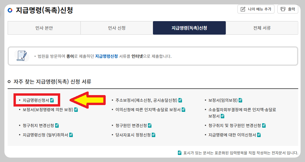 위 왼쪽 화면이 보이시면 '지급명령신청서'를 클릭하고 넘어가세요.