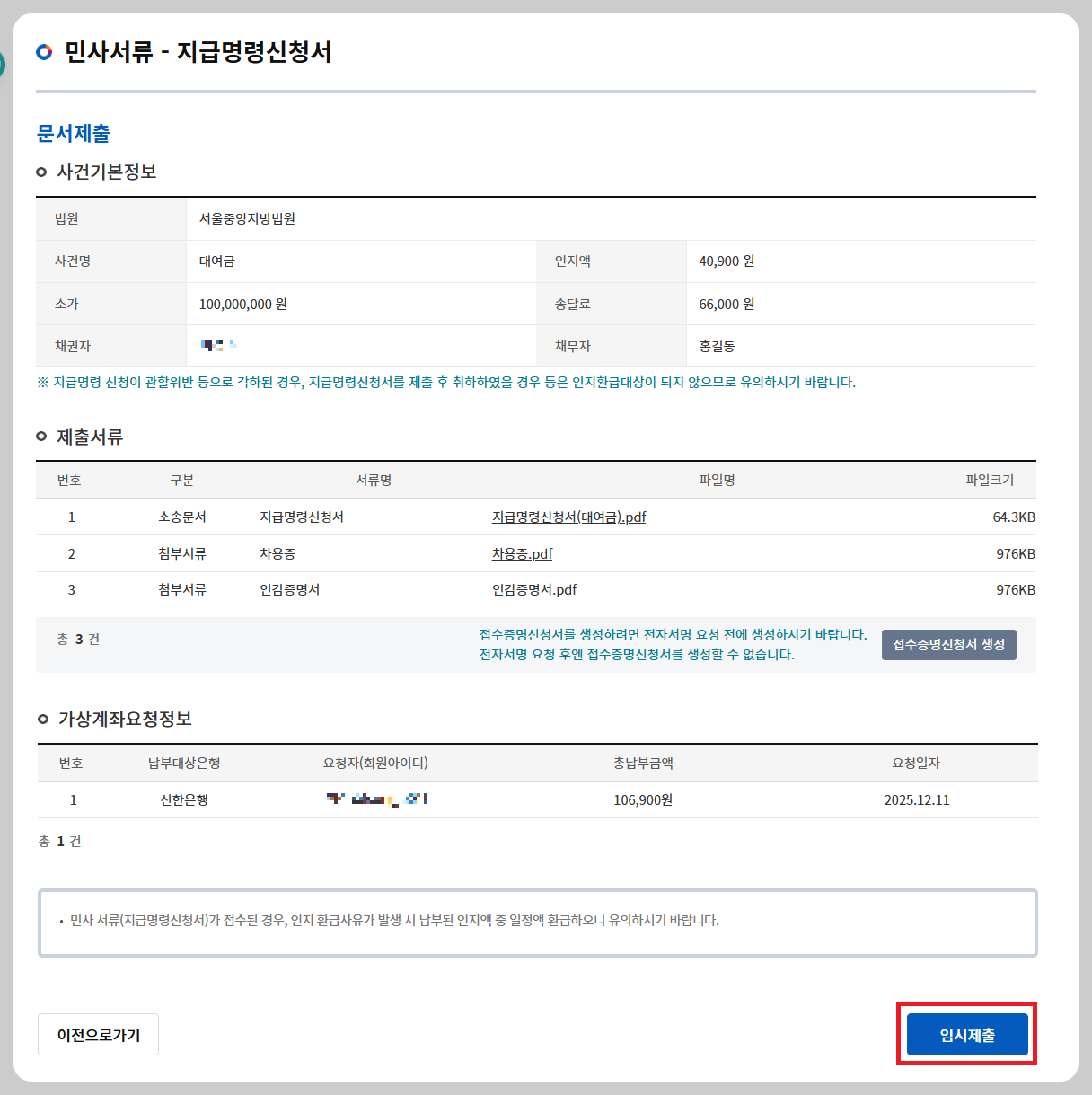 소송비용을 납부한 것이 확인되면 접수가 완료됩니다.