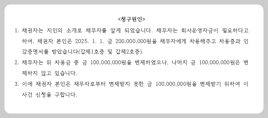 이 부분은 채권이 어떻게 발생되었고, 채무자가 변제기한이 지나도 갚지 않고 있는 사정 등을 기재하여 주시면 됩니다.