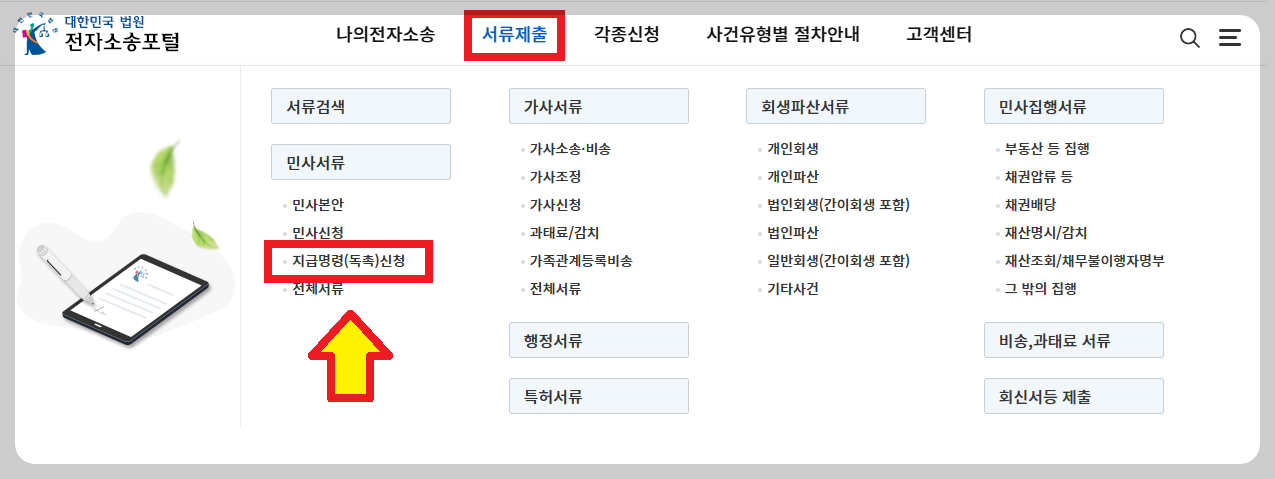 그리고 상단에 '서류제출' → '지급명령(독촉)신청'으로 들어가주시면 돼요.