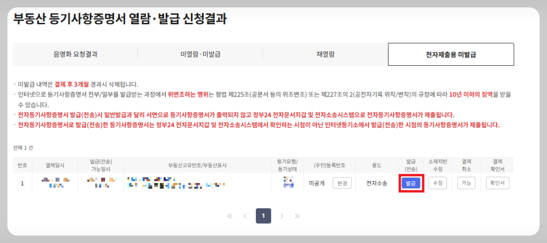 ⑥ 신청결과 화면에서 발급 버튼까지 클릭하여 줍니다.