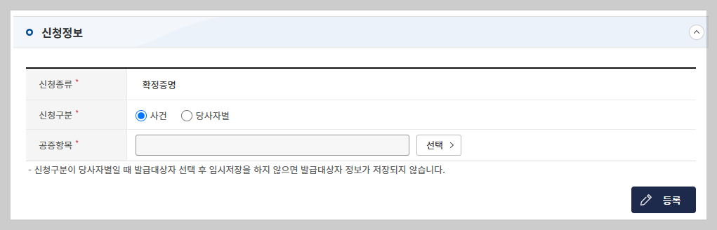 보통의 경우에는 '사건'을 선택 → 공증항목을 선택 후, 아래에 있는 등록 버튼을 클릭하시면 되요.