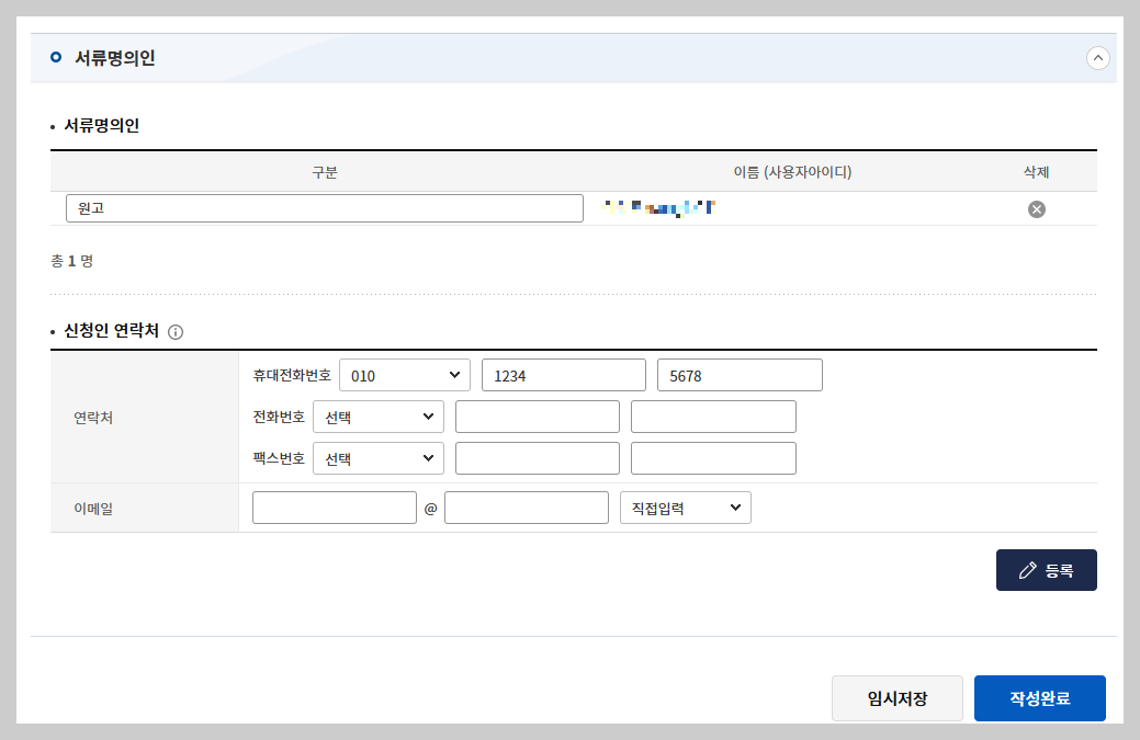 서류명의인에는 신청자 본인의 이름(전자소송 아이디)가 자동으로 입력되어 있어요.