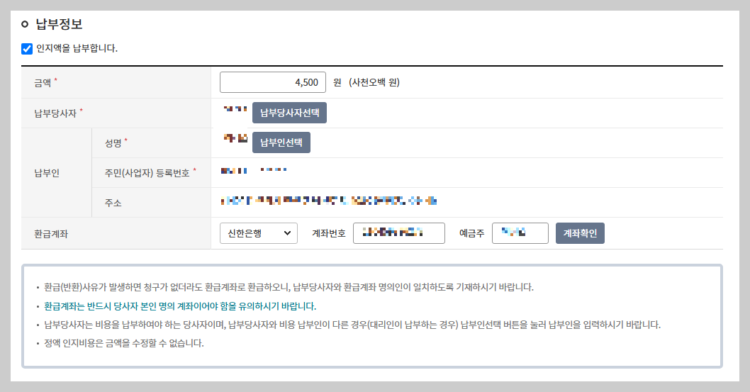 납부금액, 납부자명, 납부일자 또한 나와있는 그대로 입력해 주시면 됩니다.