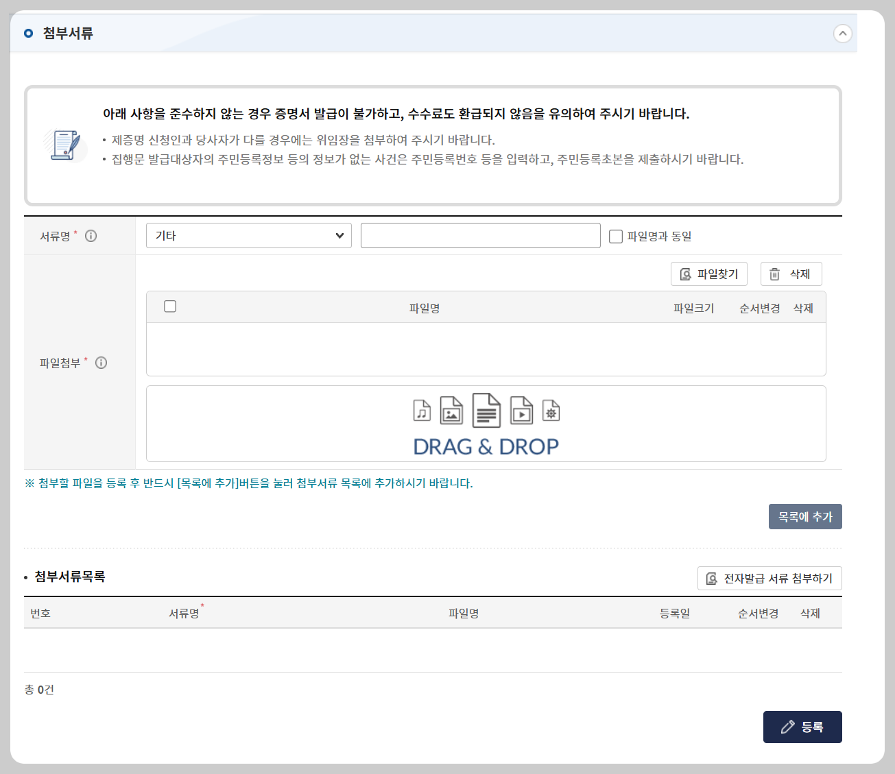 첨부서류 또한 그냥 스킵하세요. 초도발급이라 어떠한 서류도 첨부할 이유가 없습니다.